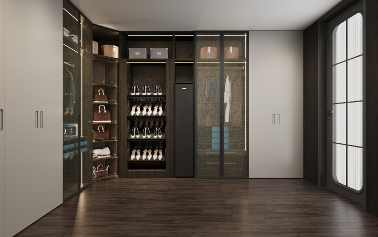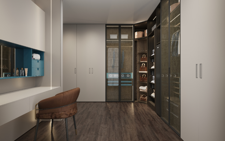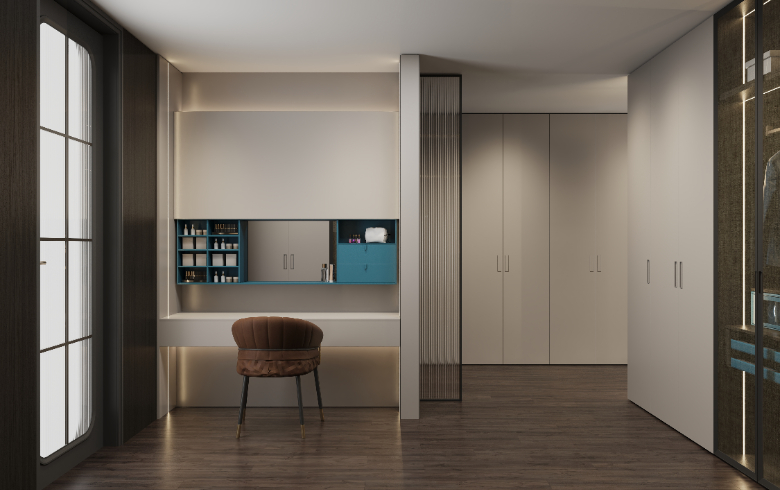 衣帽間設(shè)置梳妝臺,模塊化功能分區(qū),秩序井然,兼具實(shí)用性與視覺美,新穎別致的開放格設(shè)計,滿足Amy放置常用的護(hù)膚化妝品。