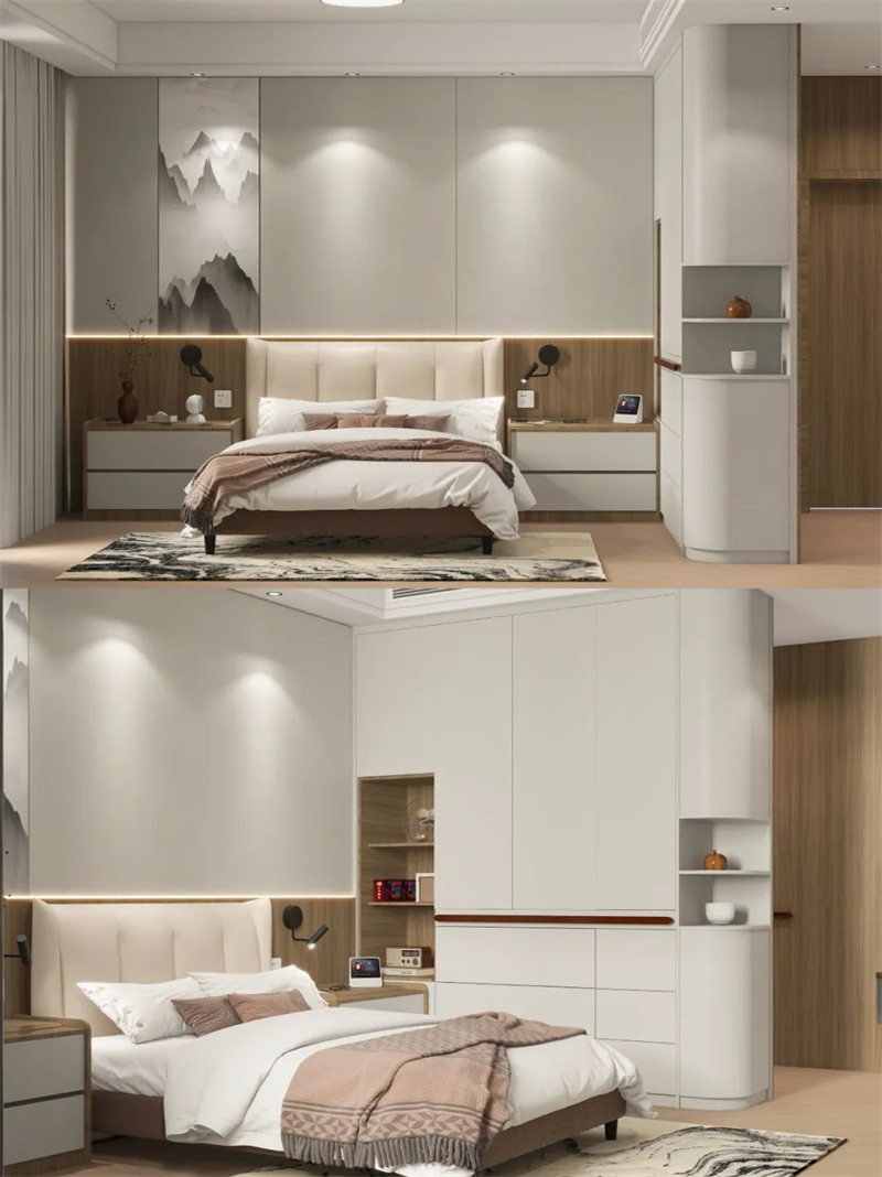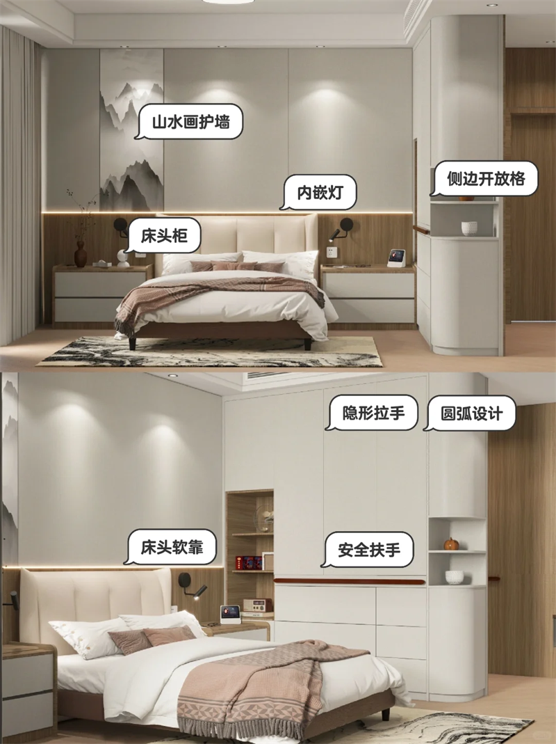 ??床頭護墻板融入山水畫,更符合爸媽審美,裝內(nèi)嵌感應(yīng)燈,方便夜間起床。