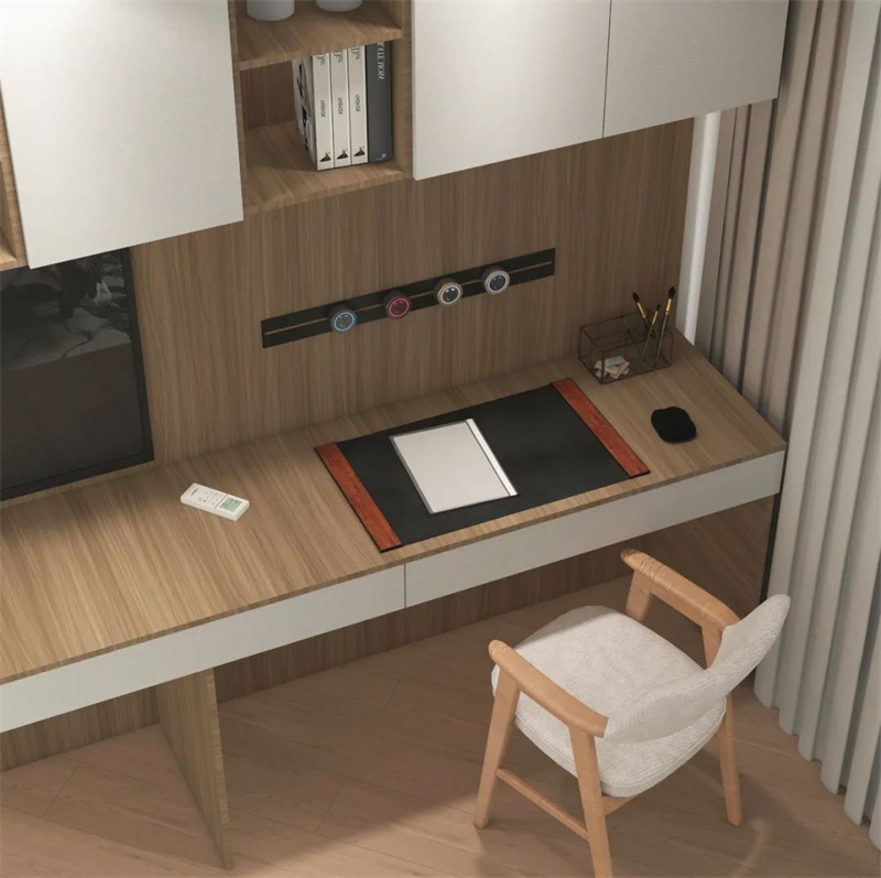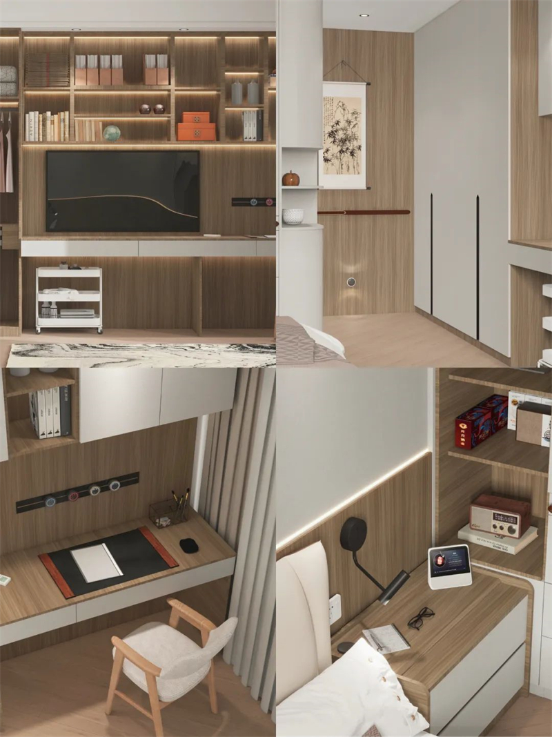 ??床尾選擇做衣柜+書桌柜一體化設(shè)計,看書、練書法、看電視,在家悠閑樂享時光?