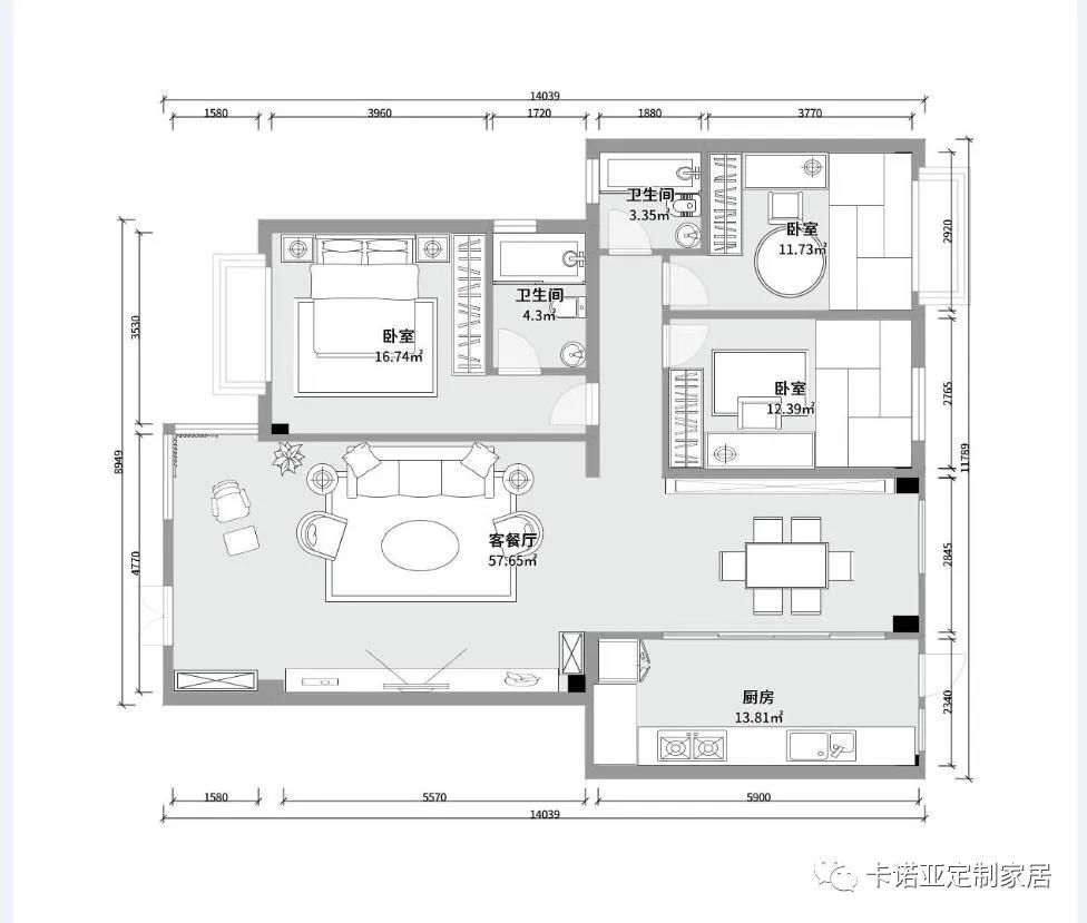 首先,將廚房擴(kuò)大改成玻璃推門增加自然光,其次利用窄墻做對(duì)稱式入墻多功能餐邊柜,