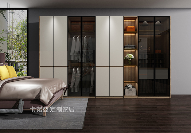 臥室比較沉穩(wěn)大氣,玻璃門(mén)半開(kāi)放式衣柜黑白相間,空間空曠開(kāi)放,有點(diǎn)極簡(jiǎn)風(fēng)。