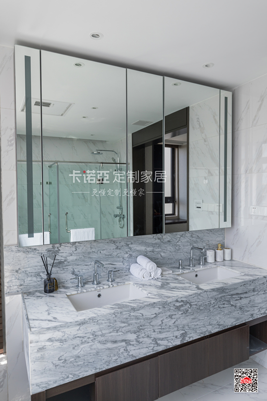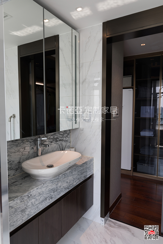 深色浴室柜體點睛,加上大面積玻璃的使用,衛(wèi)生間大氣明亮,空間通透開闊。