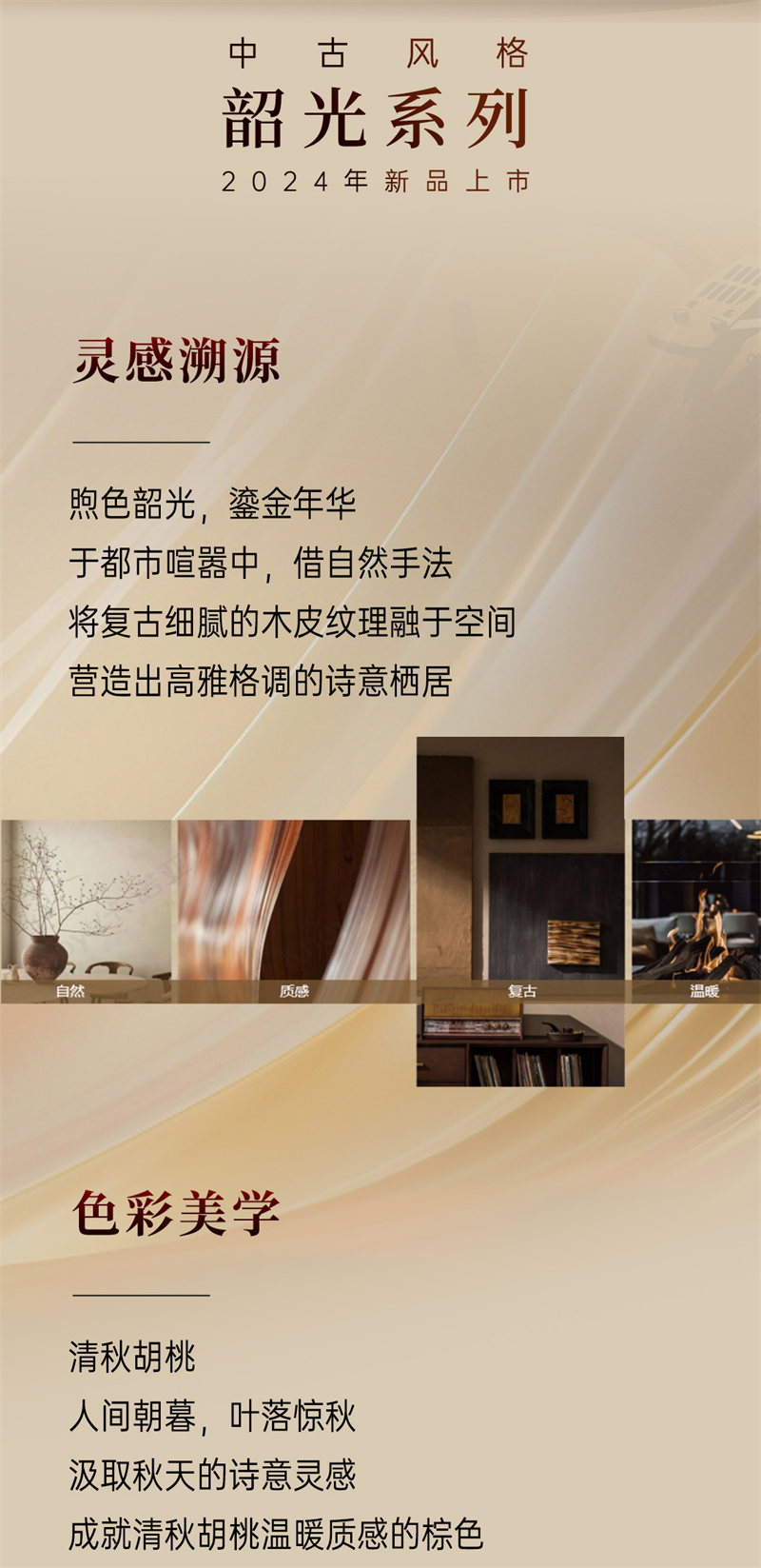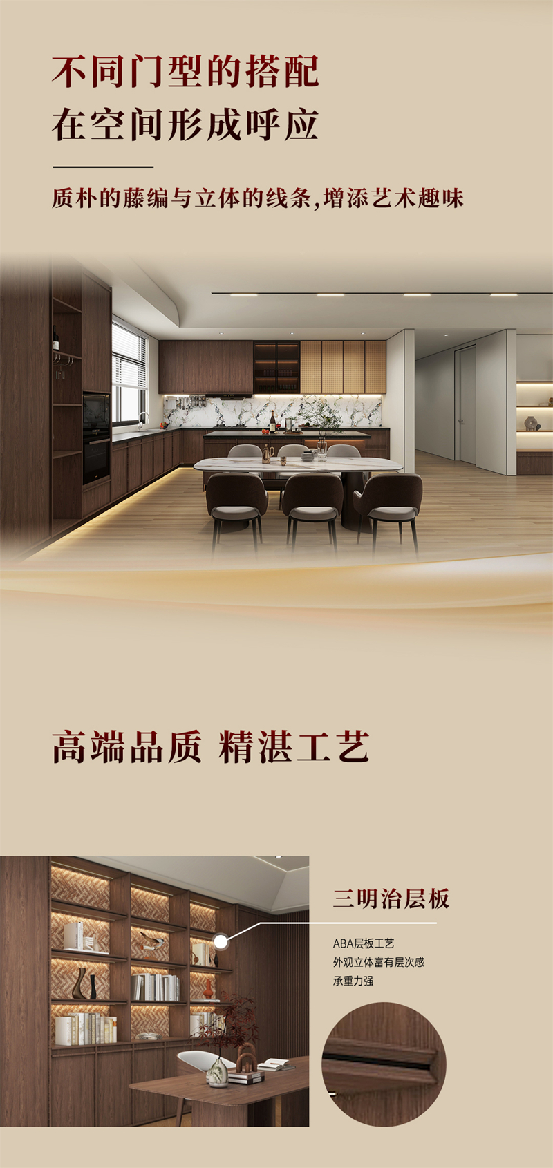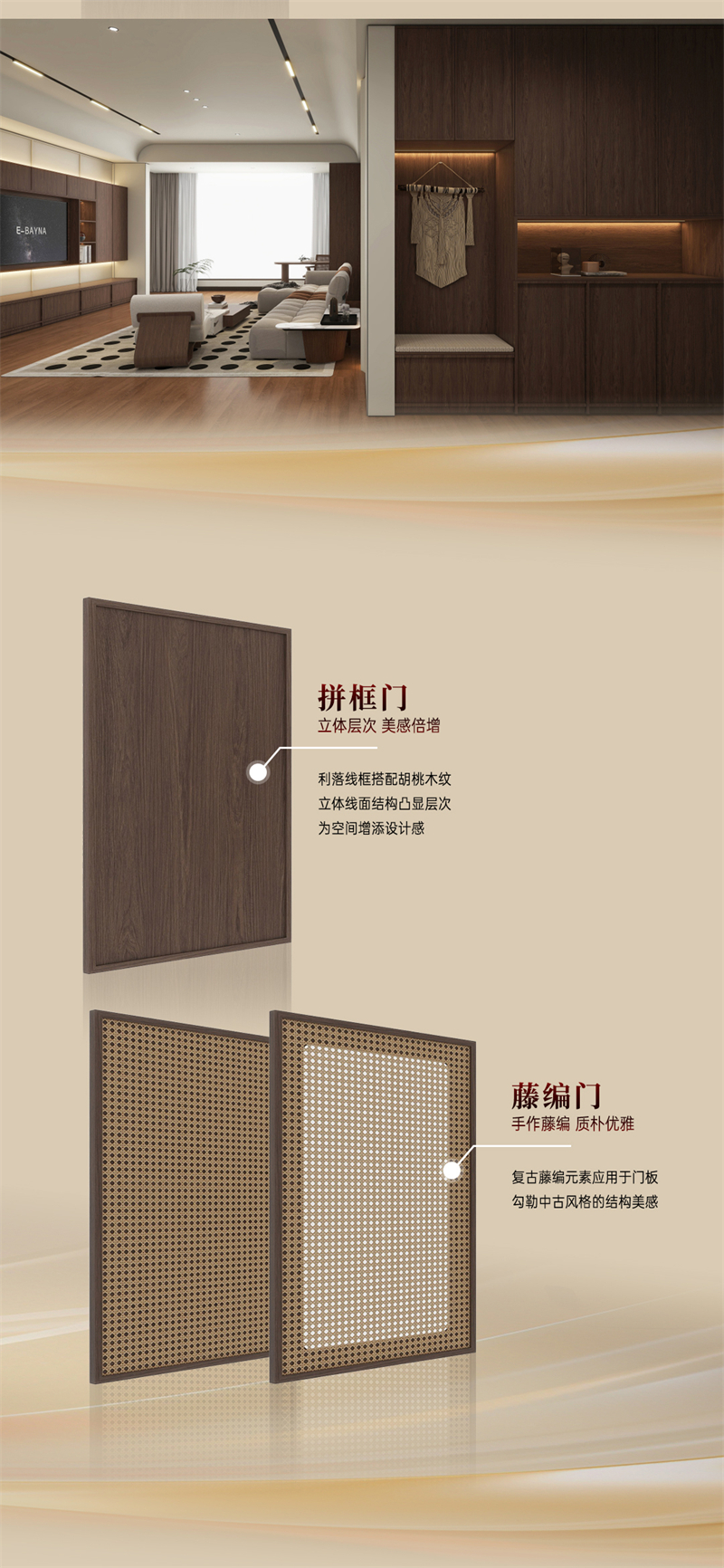 2024年新品系列,韶光 |中古風(fēng)棕色胡桃木紋為主色調(diào),搭配白色暗紋,細膩的藤編門與硬朗的骨骼門讓人聯(lián)想到古老的家具,充滿了歲月的痕跡。木紋的邊框+細密的藤編,自帶復(fù)古朦朧美感;拼樞門和藤門結(jié)合運用,使整個空間透氣感強,并擁有獨特舒適的慵懶氛圍。
