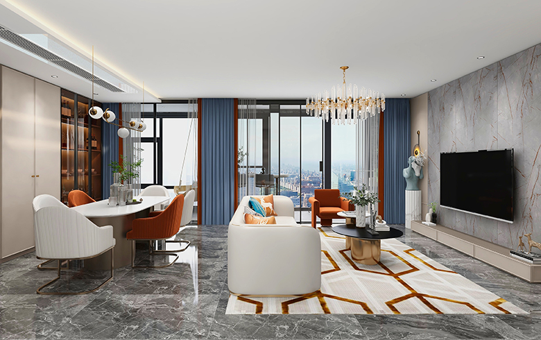 客餐廳打通,沙發(fā)隔斷,兩個(gè)空間相對(duì)獨(dú)立又相連。多人位白色沙發(fā),混搭單人位暗紅色沙發(fā),與餐桌椅在色彩上有呼應(yīng)。選擇歐式水晶吊燈,貴氣呼之欲出。一字型電視柜,臺(tái)面采用帶有木紋的“流光漫步”,減緩空間大理石與灰色系的冷感。