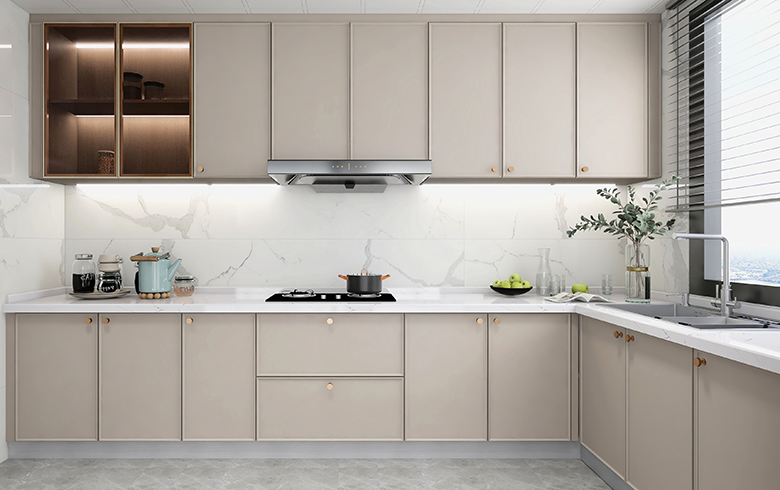 長條形廚房定制L型廚柜,轉(zhuǎn)角不浪費(fèi),大量的地柜、吊柜,炊具刀具調(diào)料通通隱藏,讓臺(tái)面保持整潔。吊柜中加入玻璃材質(zhì)+燈帶,一改整堵墻封閉式柜子的壓迫感,下廚多了一份輕盈。應(yīng)用高級(jí)“優(yōu)雅暖灰”,瞬間營造高端廚房印象。