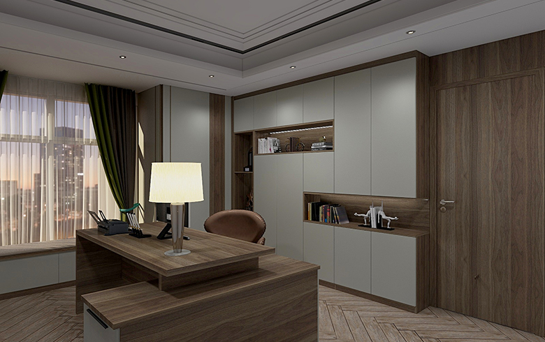 護(hù)墻系統(tǒng)采用御品木+紳士灰的創(chuàng)意混搭,配合柔和燈光,營造靜謐舒適的書房環(huán)境,專利扣線與板材花色保持統(tǒng)一無色差,且很好地包梁包柱,極大地增添了整體空間的統(tǒng)一感。