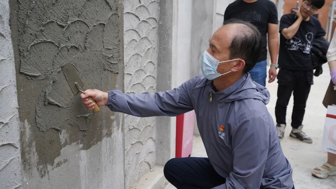 歷史建筑的修繕離不開工匠們的辛勤耕耘,他們以嫻熟技藝重現建筑細節,以精工匠心重綻建筑神采。活動現場,來自維方公司的工匠師傅為大家展示了魚鱗拉毛工藝。調制漿料,手腕一轉,著力一刷,魚鱗輪廓就這樣完成了,極具弧形美感。在場的參觀者們嘖嘖稱奇,在老師傅的教導下,大家也化身為工匠學徒,體驗了一回修繕技藝的實操過程,新鮮、有趣又有意義。
