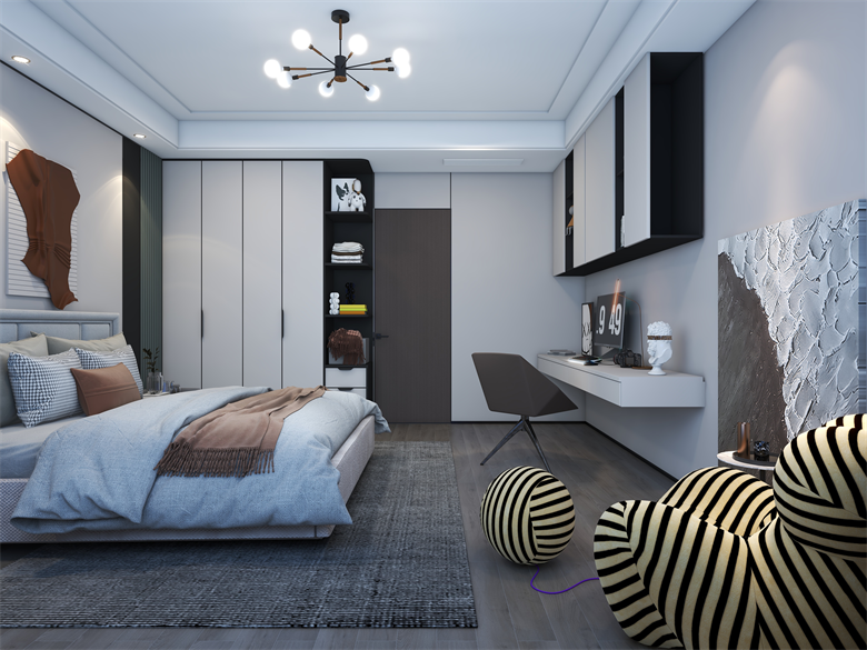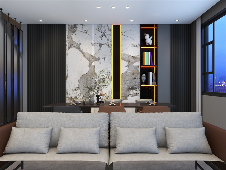 此案,為現(xiàn)代極簡風(fēng)格,整體以簡單大氣,穩(wěn)重不失溫馨,設(shè)計上嚴格遵循人體工程學(xué)原則,在造型、材質(zhì)等方面要符合人的生理和心理需求。此案設(shè)計的色彩比較單一,顏色多選用單色,或少數(shù)幾種顏色搭配。避免使用多種顏色混搭以及避免使用強烈對比的顏色,復(fù)雜華麗的顏色,反對繁瑣的花紋色彩的搭配。在色彩上追求平和、舒緩、內(nèi)斂之感極簡主義的設(shè)計多采用直線、方形,或規(guī)則簡單的幾何形狀,減去一切不必要的元素與細節(jié),比例精確,整體呈現(xiàn)簡潔明快,干凈利落感覺。此案中大部分空間運用了無主燈,因為無主燈設(shè)計講究的是“見光不見燈,分區(qū)域散點照明”。而且的無主燈設(shè)計能夠讓空間更具層次感,顯得非常的高級,若隱若現(xiàn),層次分明。