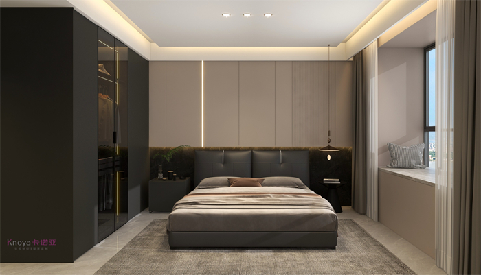 本案業(yè)主更注重與家人們的空間情感交流。戶型墻體的拆改 使布局流線更順暢,更鍥合業(yè)主的需求。玄關(guān)客餐廳采用門墻柜一體化設(shè)計,化繁為簡。鞋柜穿插式設(shè)計既有儲物功能又有美感。啞光巖板嵌入式電視背景+深色系墻板隱形門,延伸整個空間,壁爐和金屬套格更顯高級感,沉穩(wěn)大氣。內(nèi)嵌式酒柜包冰箱管線機,兼具儲物、裝飾、顏值一體。餐桌島臺做了錯位式設(shè)計,即貼合了業(yè)主的日常家居需求,又與整體空間色系相呼應(yīng)。臥室無主燈的設(shè)計還具備多種情景模式,進一步提升了臥室的氛圍體驗。