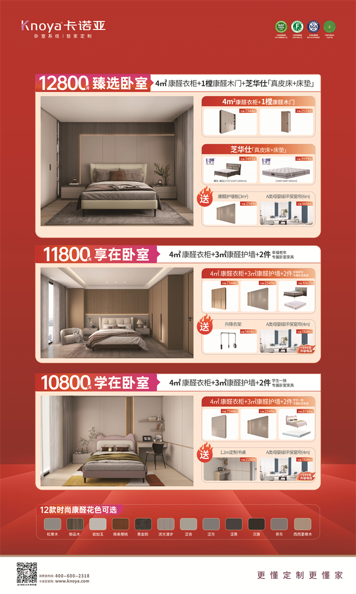 五一大促,卡諾亞力推12800元臻選臥室套餐,以及針對(duì)幸福老年的11800元享在臥室套餐、學(xué)生一族的10800元學(xué)在臥室套餐,不僅實(shí)現(xiàn)消費(fèi)者一站式購(gòu)齊,還為其帶來更多的便利和千人千面的個(gè)性化解決方案。3大套餐均包含4㎡康醛衣柜,可選十余款時(shí)尚個(gè)性的飾面花色,還有3㎡康醛護(hù)墻板、1樘康醛木門、2件專屬臥室家具、芝華仕大牌真皮床+床墊,驚喜獲贈(zèng)6米或4米A類母嬰級(jí)環(huán)保窗簾、1.2米定制書桌、升降衣架等,套餐明細(xì)請(qǐng)親臨門店咨詢??ㄖZ亞精心設(shè)計(jì)的臥室套餐,可確保與整體家居布局的協(xié)調(diào)與統(tǒng)一,全面提升臥室氣質(zhì),滿足不同消費(fèi)者的進(jìn)階居住體驗(yàn)和對(duì)品質(zhì)美好生活的追求。