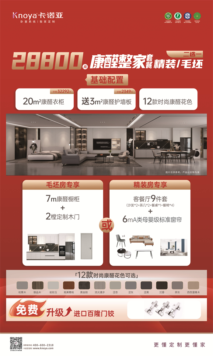卡諾亞28800元康醛整家套餐,針對(duì)毛坯房精準(zhǔn)推出20㎡康醛定制柜+3㎡康醛背景墻+7米康醛廚柜+2樘定制木門;針對(duì)精裝房精準(zhǔn)推出20㎡康醛定制柜+3㎡康醛背景墻+全屋客餐廳9件套+6米A類母嬰級(jí)環(huán)保窗簾。本套餐定制柜及背景墻,均可選十余款康醛時(shí)尚花色,可免費(fèi)升級(jí)進(jìn)口百隆門鉸。