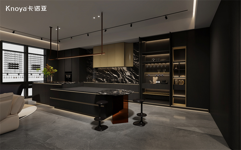 入戶、客廳、廚房空間,采用卡諾亞新品極簡(jiǎn)風(fēng)格木韻系列,黑色與金色的奢雅搭配,柔和的木紋肌理與線條營(yíng)造濃郁的意式韻味。
