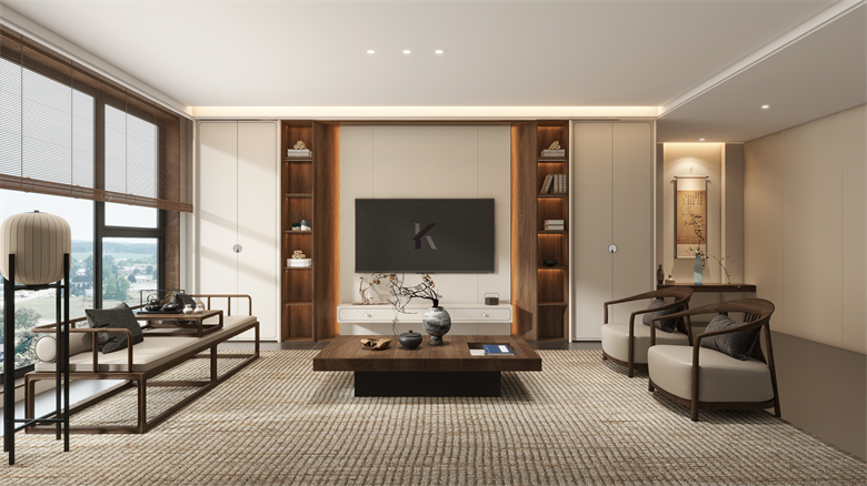 客廳作為家的核心,在林隱系列下盡顯新中式雅致。中式羅馬柱以簡潔線條傳承古韻,融入現(xiàn)代空間添層次美感。沙發(fā)背景墻3D打印山水畫卷,光影間似聞流水潺潺。懸浮電視柜輕盈,留白處藝術(shù)品點綴,空間在虛實中呼吸,盡顯精致內(nèi)斂。