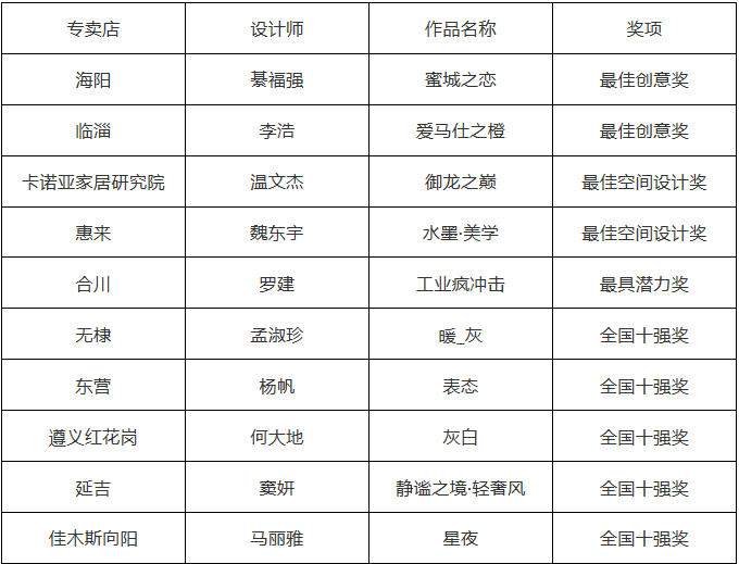 本次參賽的眾多作品經過了百強、五十強到三十強的激烈角逐,最終的十強獲勝作品脫穎而出。最佳創(chuàng)意獎、最佳空間設計獎、最具潛力獎獲得者,均獲得由卡諾亞送出的華為P30手機+獎杯+榮譽證書;全國十強獎獲得者,均獲得ipad mini+獎杯+榮譽證書;優(yōu)秀設計團隊獎,均獲得價值¥3000酷幣+培訓基金¥3000+錦旗。