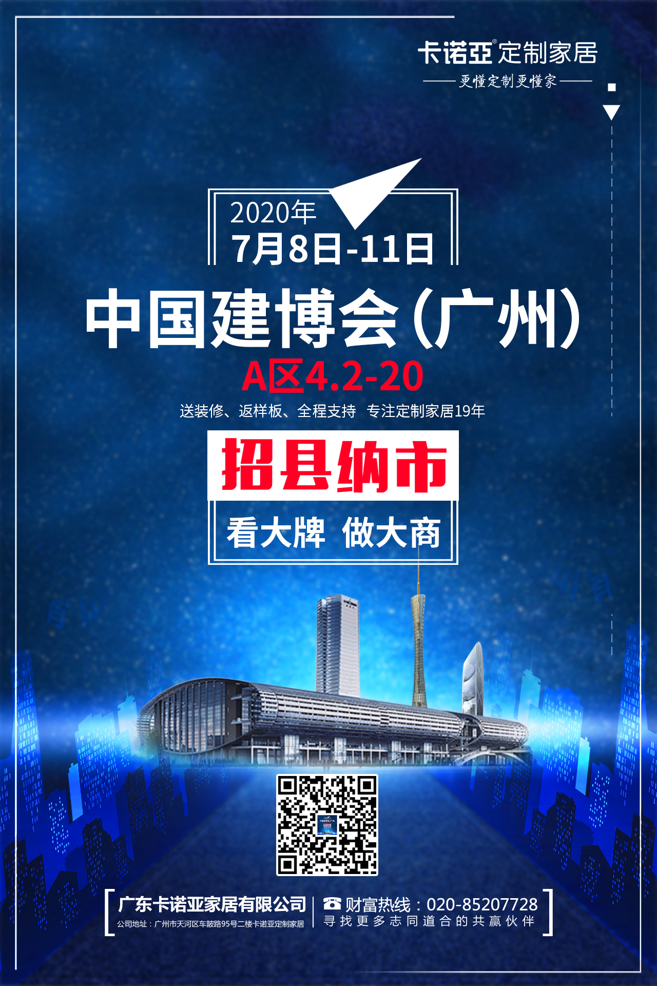2020年是不平凡的一年,面對嚴(yán)峻的疫情,中國建博會(廣州)排除萬難,為行業(yè)謀疫后發(fā)展。作為行業(yè)疫后市場復(fù)蘇的晴雨表,7月8日中國建博會(廣州)將如期開幕,這是行業(yè)疫后第一展,作為大家居建裝行業(yè)全球規(guī)模最大的展覽會,“中國全屋定制十大品牌”卡諾亞積極籌劃參展,將攜現(xiàn)代簡約與新中式混搭MIX&MATCH力作驚艷登陸展會。此外,眾多創(chuàng)業(yè)者非常關(guān)注卡諾亞的政策變化,屆時將在會場揭曉,萬眾矚目,敬請期待。