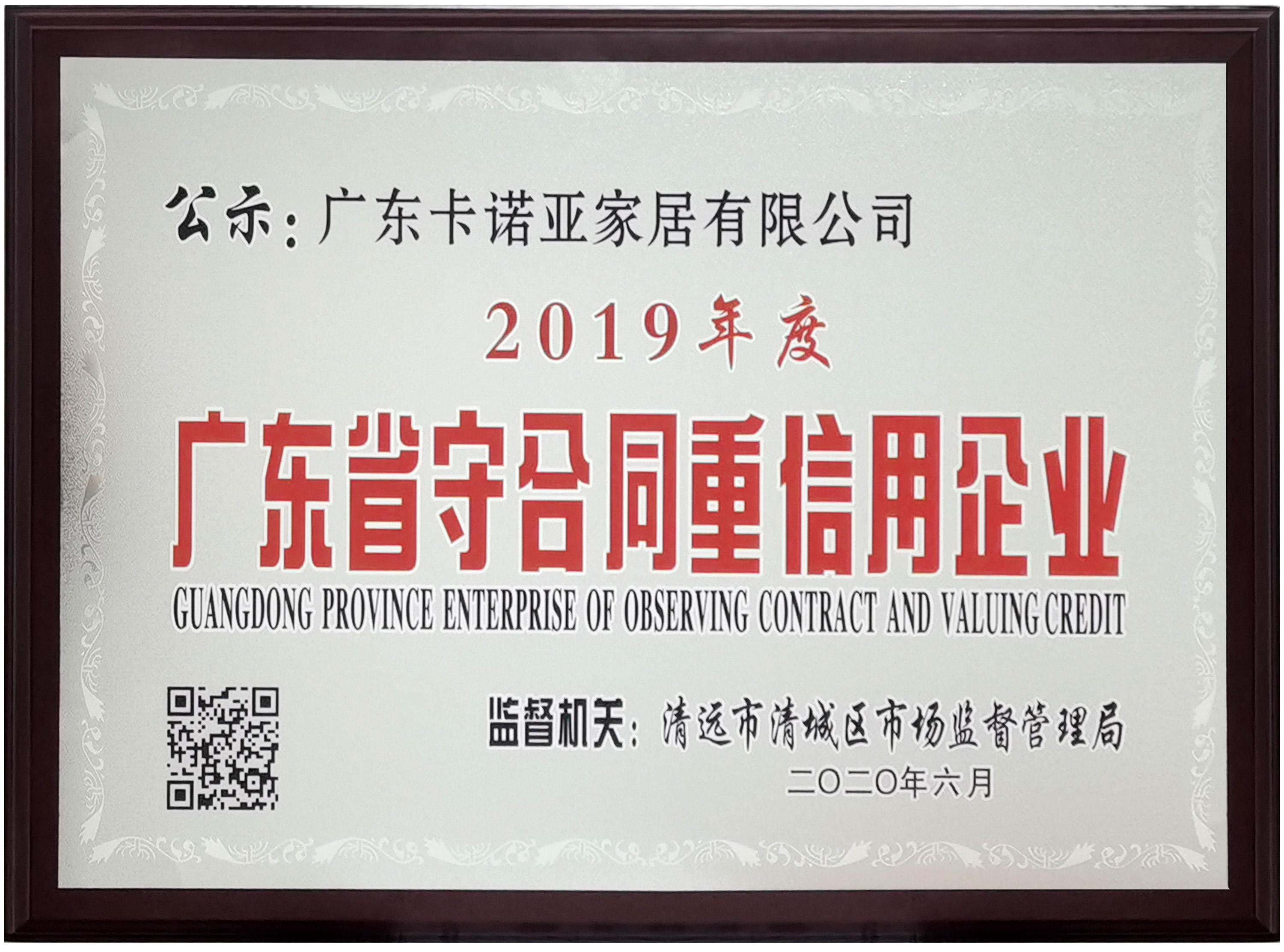 誠招天下客,譽從信中來。誠信,是立人之本,是立業(yè)之基,企業(yè)信用等級是企業(yè)提升品牌價值與品牌競爭力的寶貴無形資產(chǎn)。廣東卡諾亞家居有限公司始創(chuàng)于2001年,自成立以來始終堅持誠信的經(jīng)營理念,堅持誠信經(jīng)營、守法經(jīng)營,通過不斷強化企業(yè)誠信建設(shè),并逐漸發(fā)展成為企業(yè)文化的一部分,以此立足于市場,使企業(yè)不斷發(fā)展壯大。本次獲評“廣東省守合同重信用企業(yè)”,是對公司產(chǎn)品質(zhì)量、企業(yè)服務(wù)和企業(yè)信譽方面所做努力的充分肯定。