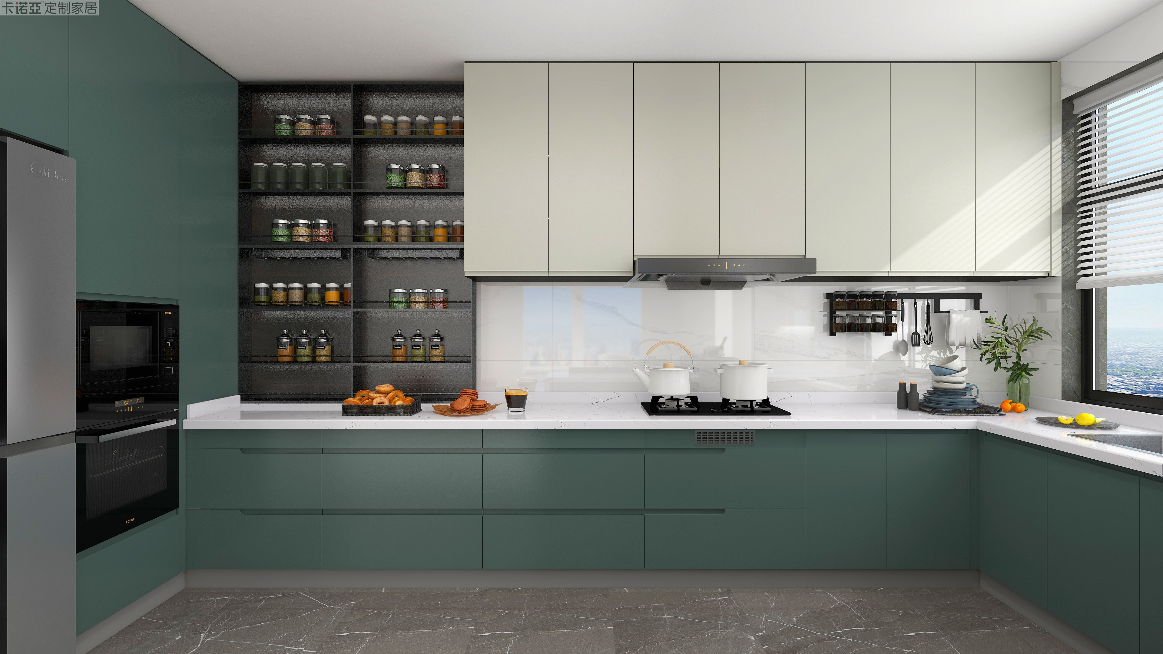 U型廚房,結(jié)構(gòu)工整,動(dòng)線合理,洗、切、炒、裝一氣呵成,利用轉(zhuǎn)角,節(jié)省空間;廚電嵌入式,整體性更強(qiáng)。“鈴蘭綠+水云紗”的高級配色,櫥柜的柜門飾面覆上環(huán)保水性漆,耐臟、耐高溫、耐黃變,易打理,歷久彌新,完美匹配高端廚房。