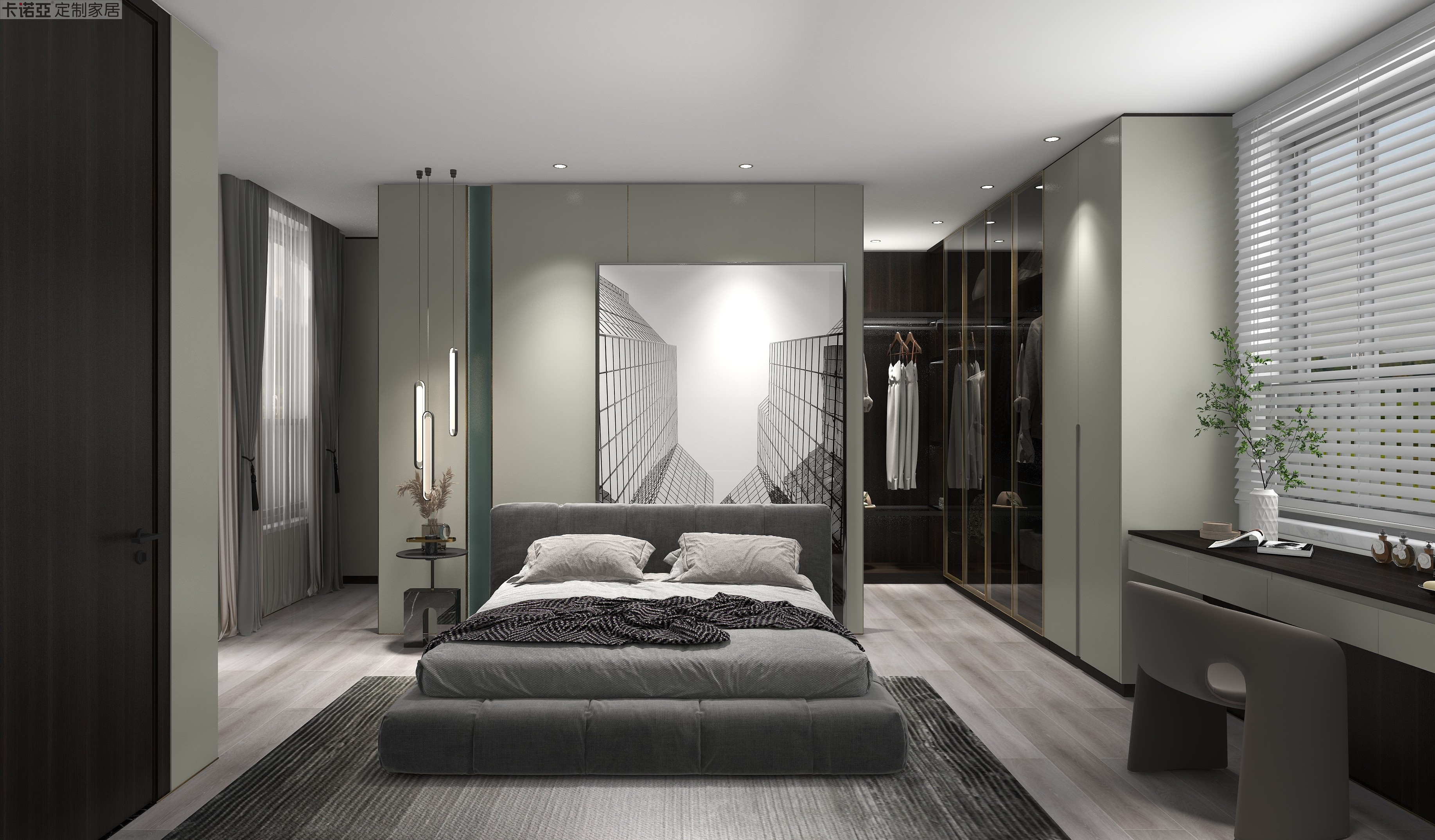 整體以莫蘭迪色系為基調(diào),低飽和度的色系,讓空間更顯質(zhì)感,帶來寧靜溫馨的睡眠氛圍。衣柜“水云紗”柜門搭配“黑金剛”柜體,與臥房內(nèi)的軟裝呈現(xiàn)一致的色調(diào),床頭啞光的“水云紗”護(hù)墻板搭配原木色木地板,溫柔溫馨,讓好夢天天相伴。