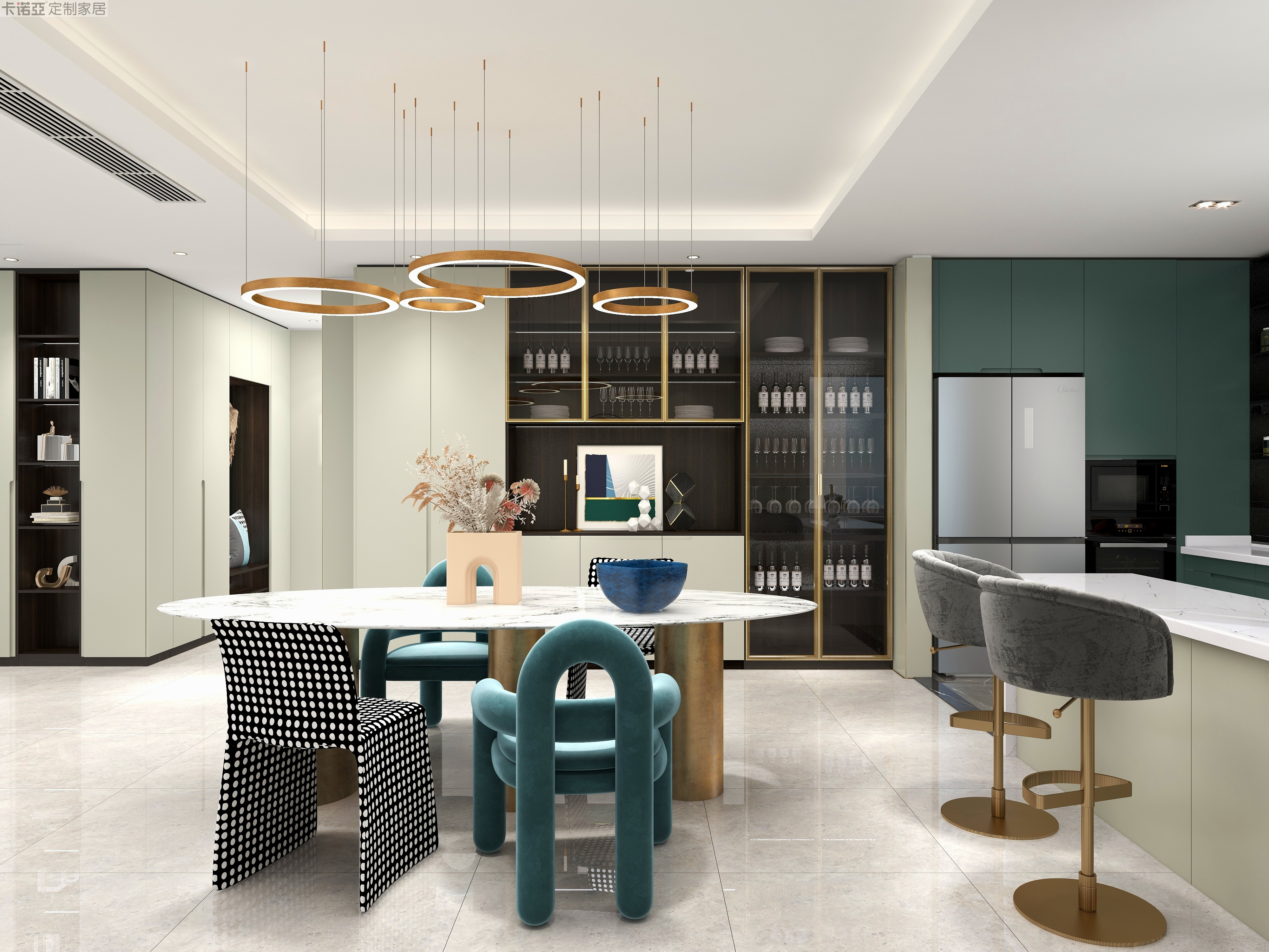 洋溢幾何造型的餐椅,灰色與綠色的混搭,格外吸睛,搭配圓潤的餐桌和金屬的餐桌腳,營造輕奢質(zhì)感,打造滿滿的就餐儀式。餐邊柜大量使用玻璃門,展示美酒、傳達(dá)主人的品味。封閉柜則可以收納餐具、紙巾、雜物等,時(shí)刻保持餐桌的整潔。
