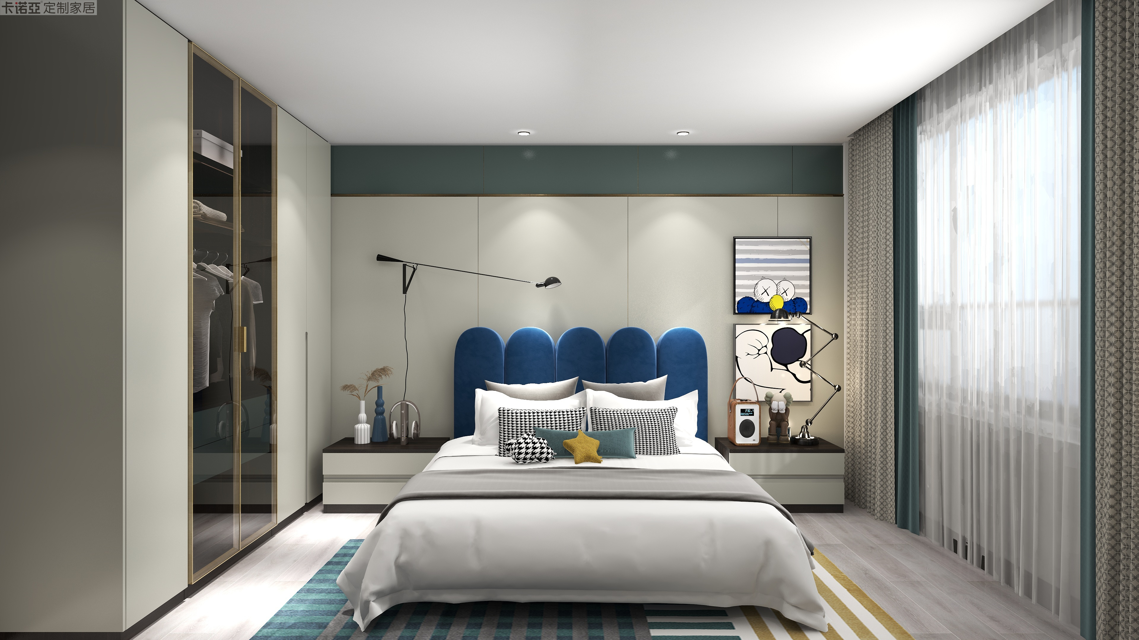 一改傳統(tǒng)鮮艷色彩的使用,采用“水云紗+鈴蘭綠”冷靜色,溫暖深木色“黑澤明”點(diǎn)綴,營造寧靜而自然的睡眠空間;床屏花瓣造型、可調(diào)整床頭燈、俏皮漫畫等裝飾物,打造一個(gè)可愛又能激發(fā)創(chuàng)造力的空間。