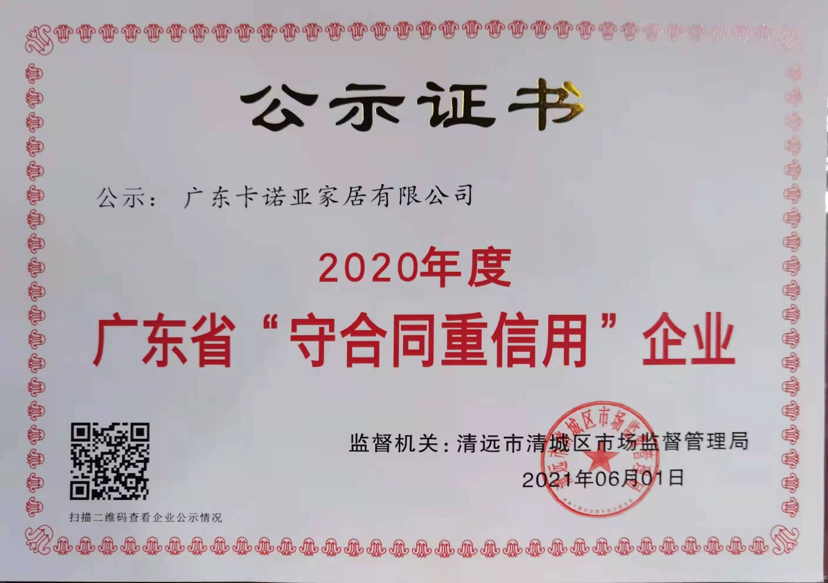 近日,廣東省清遠市清城區(qū)市場監(jiān)督管理局對廣東省守合同重信用企業(yè)進行公示,卡諾亞專注定制家居20年,一直以來憑借企業(yè)自身完善的合同管理機制及良好的合同履約狀況等企業(yè)誠信信用體系,連續(xù)兩年榮獲廣東省“守合同重信用”企業(yè)稱號,這是對卡諾亞誠信守約的經營管理、優(yōu)良的信用文化建設與良好的客戶口碑的肯定。